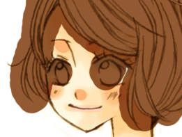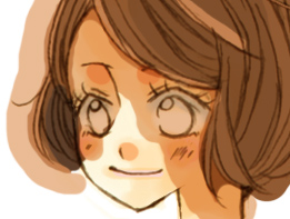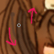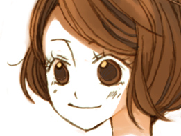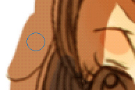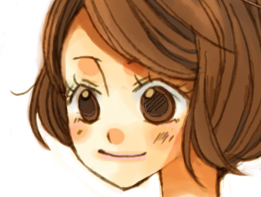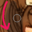 まず全体に色を載せます。だいたい髪と一緒のレイヤで目も塗ってしまうのですが、まずは髪から! この色をベースに、ハイライトとローライトで色を付けていきます。 塗り方、使う筆は肌のときとほぼ変わりません。でも髪の毛はほとんど ぼかし系の筆は使わないかも。。 ![]() 拡大表示にして塗っていきますが、マウスで細い筆でちまちま塗っていくと時間がかかるし カーブのラインが微妙ガタガタしてたり、色ムラができるのが嫌なので、 ![]() カーブだけ目途を付けて太めの筆でざっくり塗ってしまいます。 で、そのあと余分なとこをそれより小さめの筆で削る…という感じでやってます。 ![]() 暗い色を入れたら明るいブラウンで髪に光が当たるところ、髪の毛と肌に近い部分を塗っていきます。