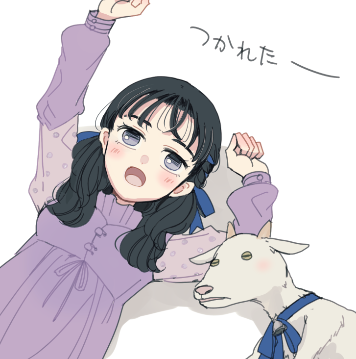 ヤギは驚くと手足が固まったままひっくり返るんですが、その気絶ヤギの動画を見てたらヤギを描きたくなりました。白ヤギのお手紙の童謡っぽく女の子を黒髪にしたらいい感じに紫の服に合ったのでよかった!