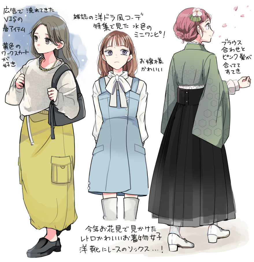 今日の落書きの一番右の子は3月にお花見で見かけたんですが、ほぼ後ろ姿しか見えなかったので後ろ姿です。でも私の横を前方へ通り過ぎていった瞬間、着物の下に首元がフリルのブラウス合わせてるのが見えてすごくかわいかったので、桜の写真撮る前に即スマホにコーデをメモし絶対日記に残そうと決めていました。