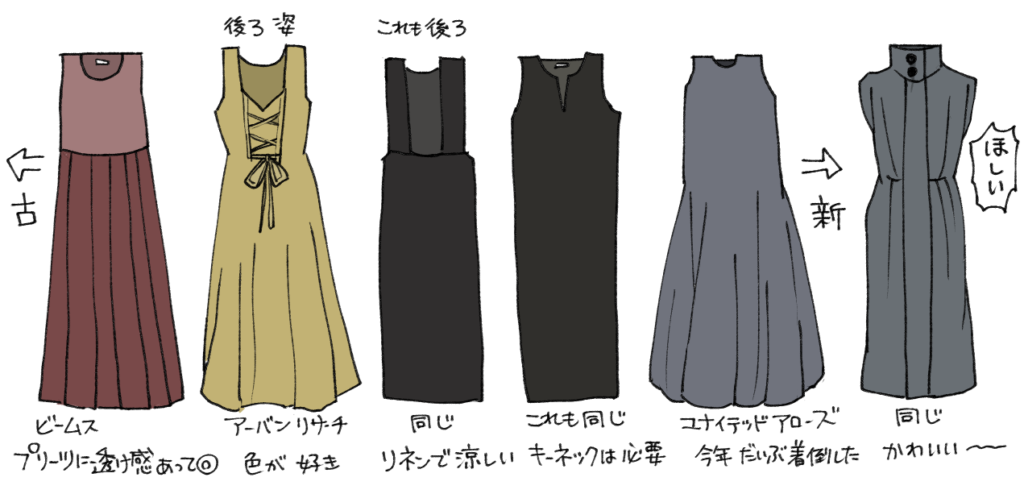 購入順に行くと一番左のブラウンワンピを捨てるべきなんですが、最近9月に入っても暑いのでブラウンという色は秋っぽさもあり大変役に立ちます。同じような理由で辛子色のワンピも…。特にこれは色味がなかなか無い感じで好きです。そろそろ背中のリボンは年齢的に厳しいか?と思うのでミニ丈のシャツやジャケットを羽織ることが多い