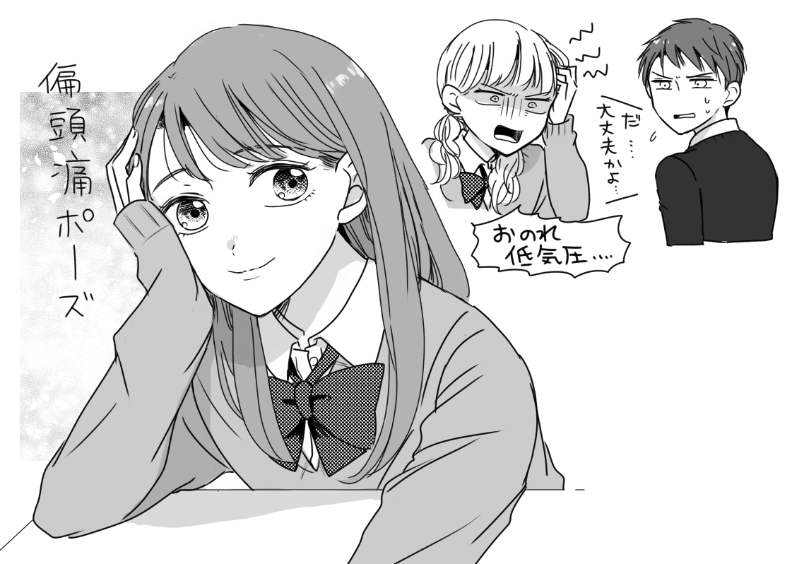 頭痛 2025.02.122025.06.15 創作落書き 青春17きっぷ 千鶴の落書きがしやすすぎてつい回数が多くなってしまう 寒い時期は神経周りとか不調が起こりやすい体質ですが、今年は片頭痛も発生していていや~な感じです。特に寒さが厳しい日に出るので自分の場合は気圧より冷えが原因なのかもしれない… 静かに暖かい場所で横になってやりすごしていますが煩わしいですね!しかしあまりネガティブになるのも嫌なので片頭痛ショットを描いておきました 康介は姉たちの中に片頭痛持ちがいて、耳ツボなど対処法を見ているので絹代に教えてやりたいけどちょっと遠慮してる様子