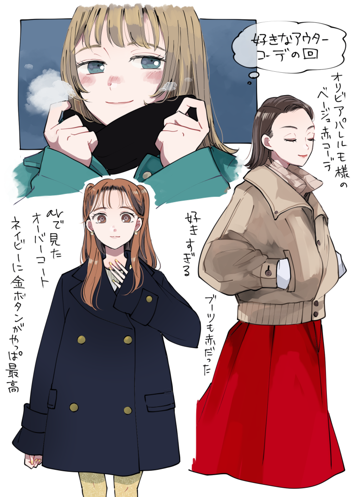 寒さへの文句を書いていたら今週後半からいっきに気温があがるじゃないですか!?放置してたアウターコーデの落書きを慌てて仕上げました。寒くなくなるのはありがたいけど急すぎる!