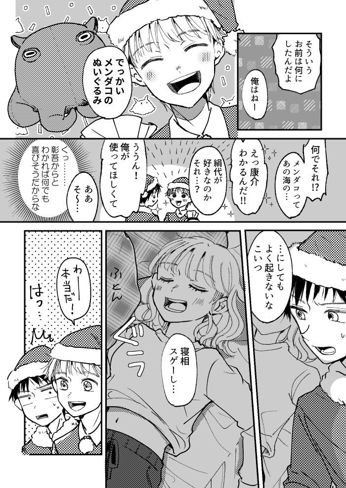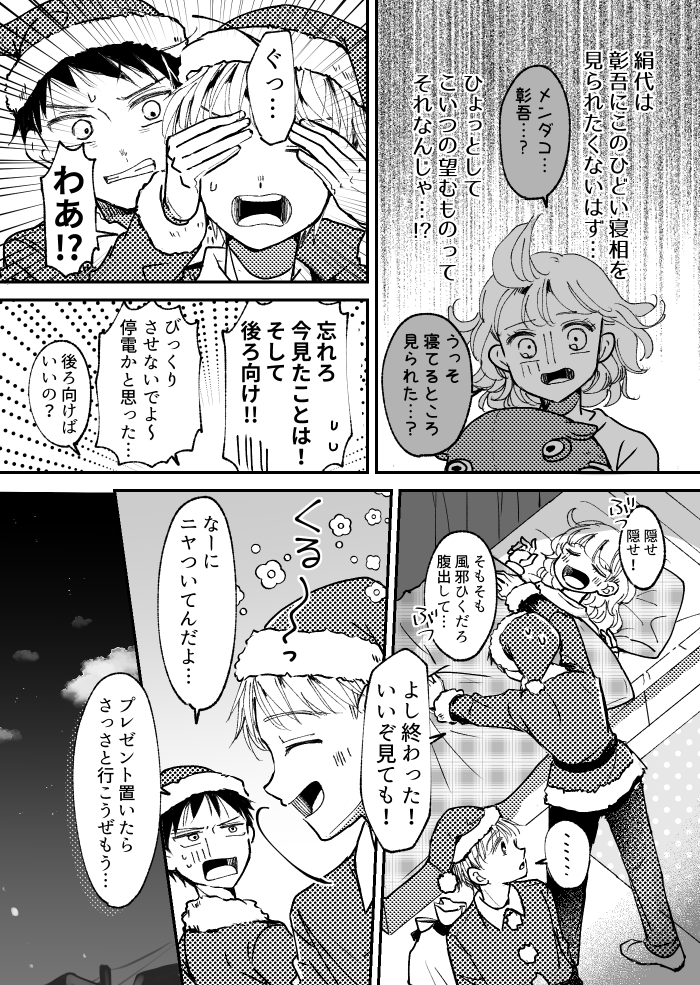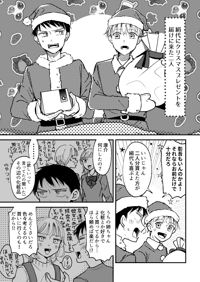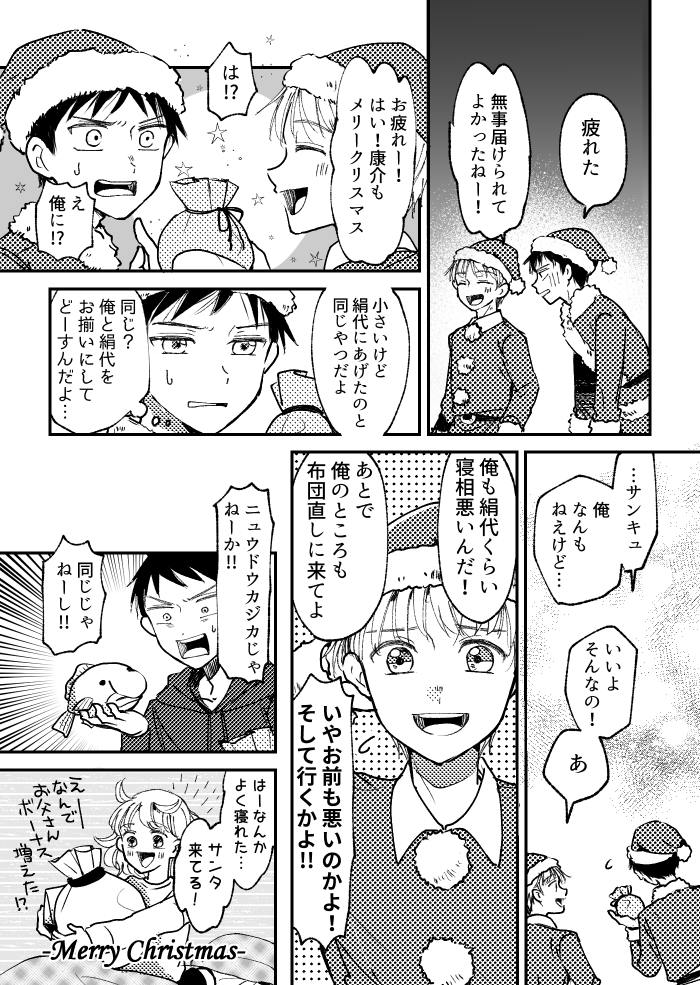 メリクリ! 2022.12.23 創作落書き 青春17きっぷ 康介と彰吾それぞれの良いところを描こうとしたら絹代の出番がほぼ無くなりました 二人とも差出人は書かずでしたが有難く使う絹代 一日早いですがメリークリスマス!よい週末クリスマスを~