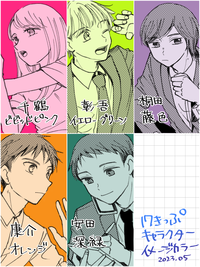 以前描いたキャラのイメージカラー落書き後編です。こっちの顔ぶれのほうがすんなりイメージ出てきた気がする…特に康介は元々オレンジのイメージが強かったな~ 後半戦も描くの楽しかったです!