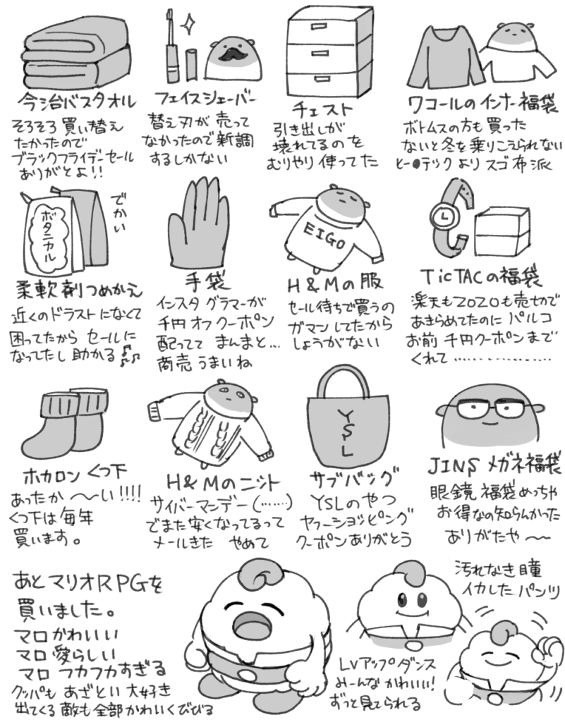 あとは年々色んなお店がブラックフライデーに力入れてる気がするので、来年以降に生かし…こたつショッピング危険週間の無駄買いやめたい…(ここに入らなかったけどショーツの福袋を二つ買ったのでパンツストックが+8になった)
